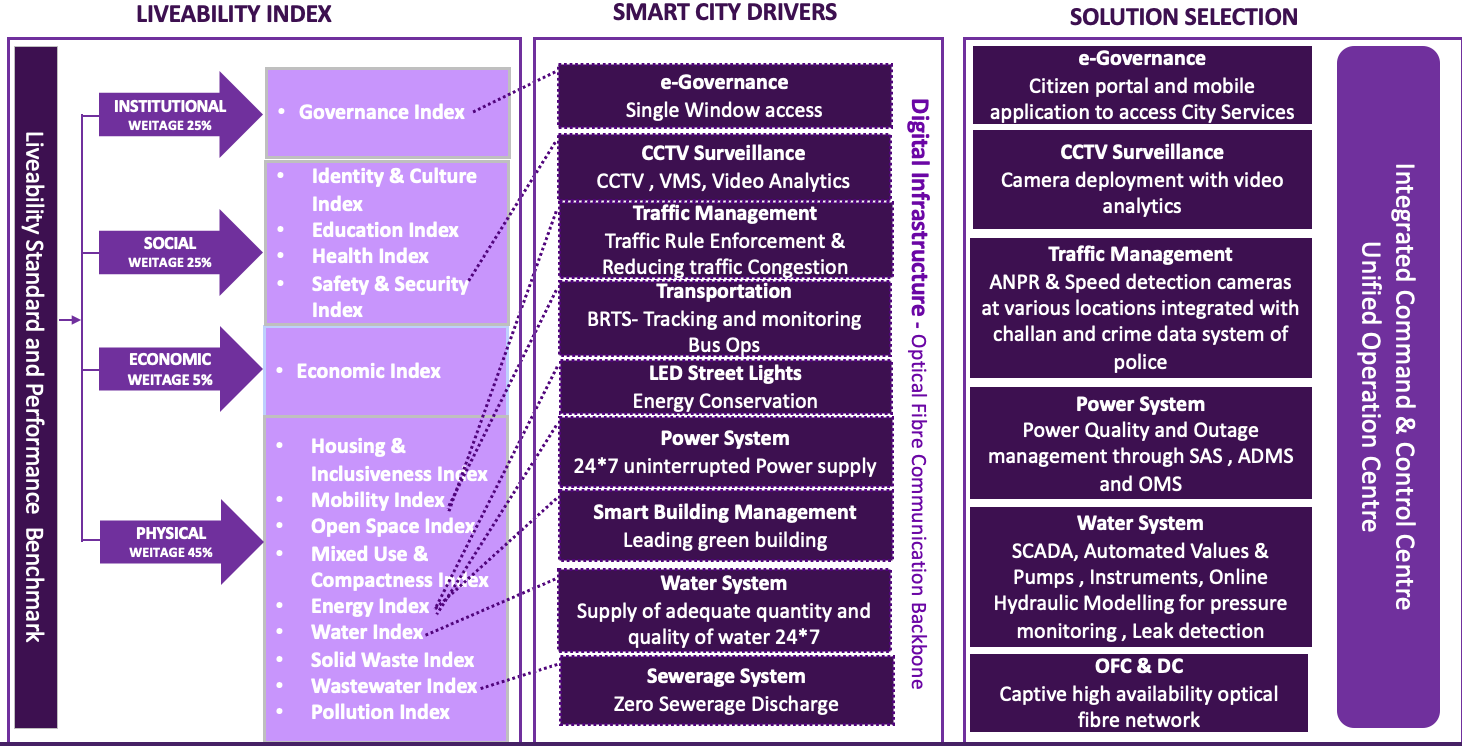 45% is the physical weightage for city infrastructure which means the city needs to improve on its physical infrastructure (water, energy, sewerage and focus on transportation, waste collection). 25% is social and institutional weightage while the other 5% is the economic weightage. To improve all of these areas, digital solutions need to be implemented.