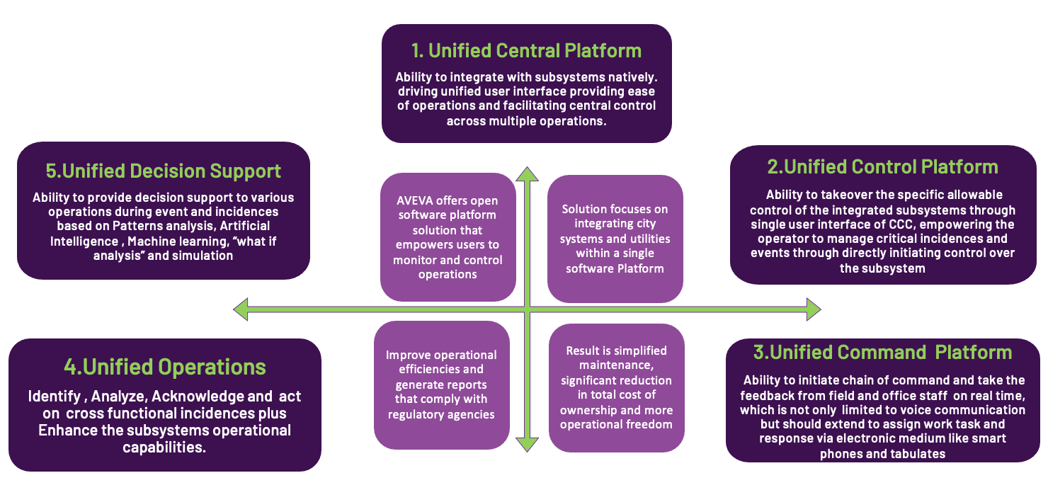 - Unified Central Platform: Allows integration with all types of technologies-based solutions like control systems which are controlling and monitor water and wastewater systems or traffic signaling systems or CCTV surveillance camera systems.